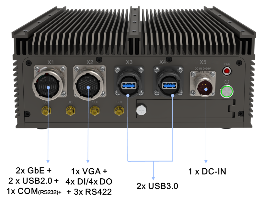 The AV600TH-A20-PA1 stands out due to its rugged design and extensive functionality. It is equipped with MIL-STD Amphenol type connectors and boasts full IP66 protection, making it capable of withstanding harsh environmental conditions. Furthermore, the AV600TH-A20-PA1 supports an extended temperature range, from -40°C to 70°C, and features a MIL-STD-461 18V~36V DC-input power supply. This power supply safeguards the system against voltage surges, ensuring the reliability of critical components and the system itself.