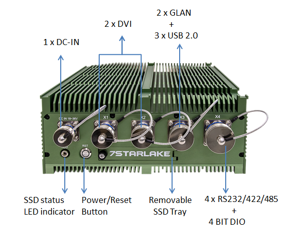 The AV600X-CH is distinguished by its robust design and high functionality. The system is equipped with MIL-STD Amphenol type connectors and boasts full IP66 protection, enabling it to withstand even the harshest environmental conditions. Additionally, the AV600X-CH supports an extended temperature range from -40°C to 55°C and features a MIL-STD-461 compliant 18V~36V DC-input power supply. This power supply safeguards the system against damage from voltage surges, further enhancing the reliability of its critical components and the system itself.