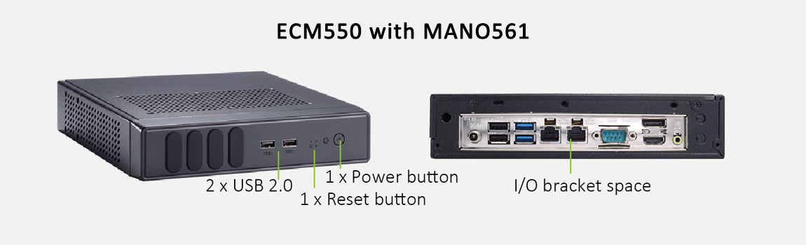 The MANO561 has Intel® UHD Graphics and provides two HDMI, one LVDS, and one VGA port in support of triple displays. This feature can be widely applied in various fields, such as manufacturing monitoring, medical, digital signage, and self-service kiosks.