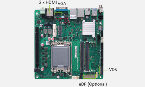 Thin Mini-ITX SBC with LGA1700 14th/13th/12th gen Intel Core i9/i7/i5/i3, Pentium or Celeron processor HDMI, VGA, LVDS, USB 3.2, M.2, and Dual GbE LAN