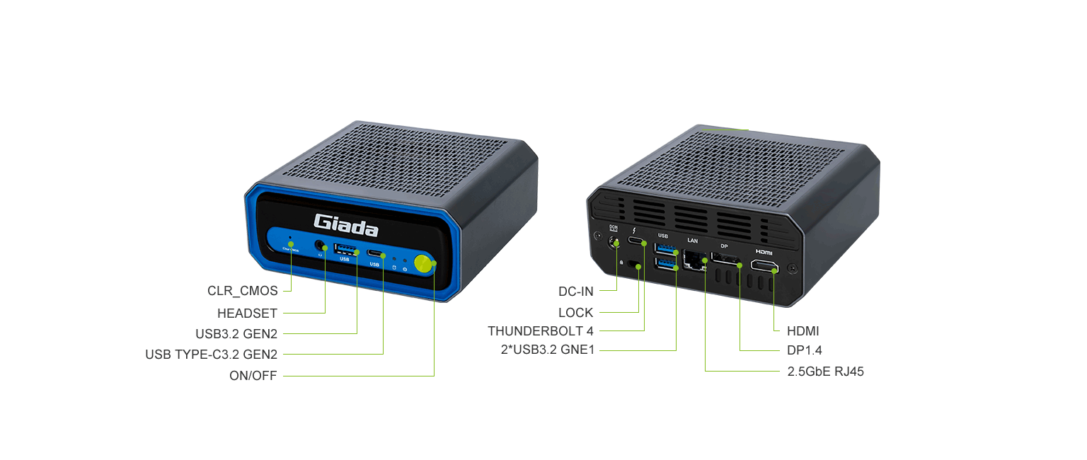 | Description | Designed for AI tasks such as image/video editing, creative projects, and team collaboration, the Giada AI PC N601 is powered by Intel's AI-capable Meteor Lake Ultra 5 / Ultra 7 processors. With up to 34 TOPS computing capability, the N601 can efficiently handle various AI tasks locally, enhancing workplace efficiency and privacy. Giada N601's ability to capture and process visual data, combined with the quality of its display outputs, is industry-leading. An HDMI 2.0 port and a DP 1.4 are both capable of achieving 8K resolution at 60Hz, leverage Intel®: Arc graphics to deliver crystal clear imaging for gaming, AI-assisted healthcare imaging and smart retail signage. The overall performance of Intel®: Arc graphics is doubled compared to the previous generation Iris Xe integrated graphics. The N601 features an ultra-compact design for easy deployment while providing users with powerful expandability. It offers 1 M.2 slot supporting PCIe 5.0 NVMe SSDs, with read/write speeds of up to 10 GB/s (80Gbps). Additionally, it provides an M.2 slot supporting PCIe 4.0 NVMe SSDs, with read/write speeds of 5 GB/s (40Gbps), and a 2.5-inch SATA hard drive bay. The Giada N601 enables ultra-fast file sharing with Thunderbolt 4, capable of reaching speeds of up to 40 Gbps and making transferring videos (up to 8K@60Hz resolution, or extension 2X 4K@60fps video playback) and gigantic files a breeze. Giada N601 incorporates an M.2 (2230) for flexible Wi-Fi/BT functionality, supporting Wi-Fi 7. Wi-Fi 7 elevates wireless experiences and feature extreme data speeds and consistent low latency. Wi-Fi 7 can deliver peak rates of over 40 Gbps, a 4X increase over Wi-Fi 6E. With Giada N601, say goodbye to crowded networks and hello to a smoother, more reliable connection.
